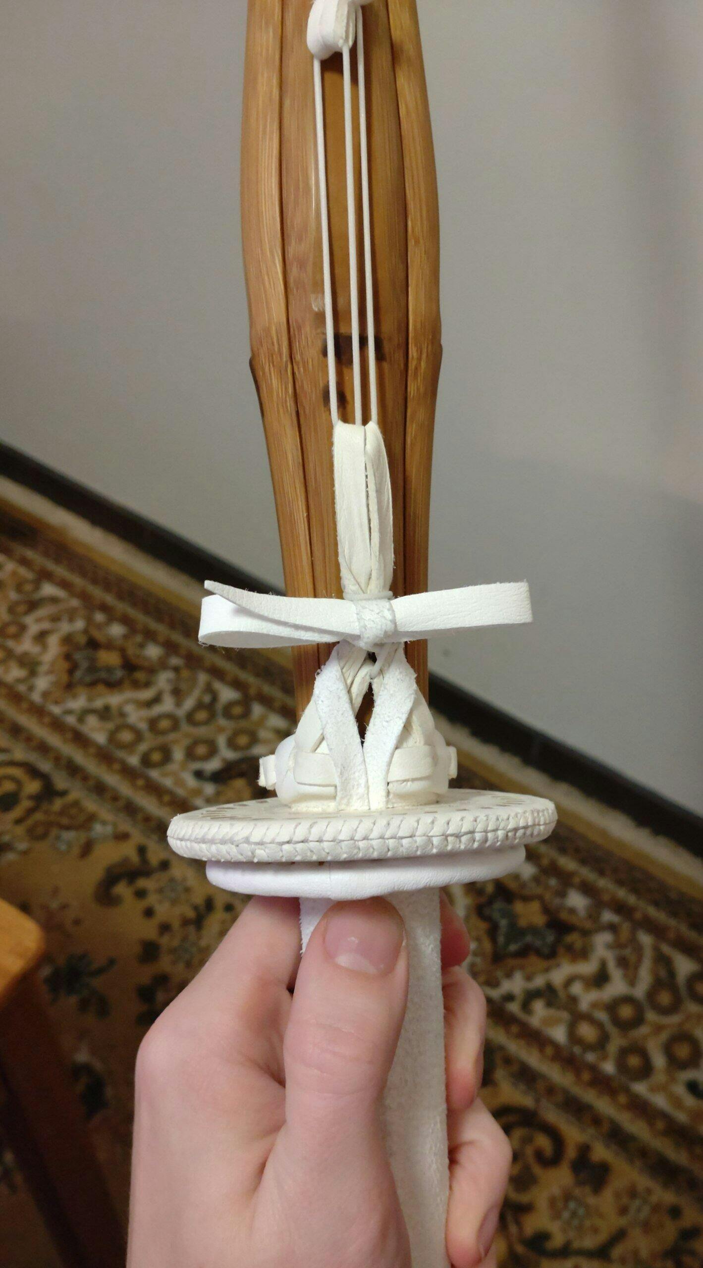 For those who want a traditional way of securing their tsuba to their shinai - this charming tsubadome is made of deerskin. It uses two leather strips to secure itself to the shikumi of your shinai providing a secure fit and an elegant and traditional appearance. You can see the method of tying the tsubadome in the picture below.